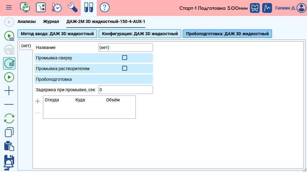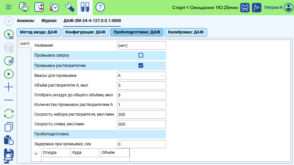 Промывка пробой доступно, если Режим промывки = Из виал.