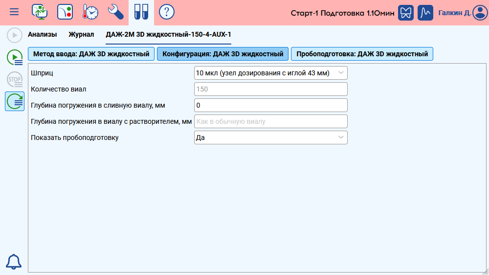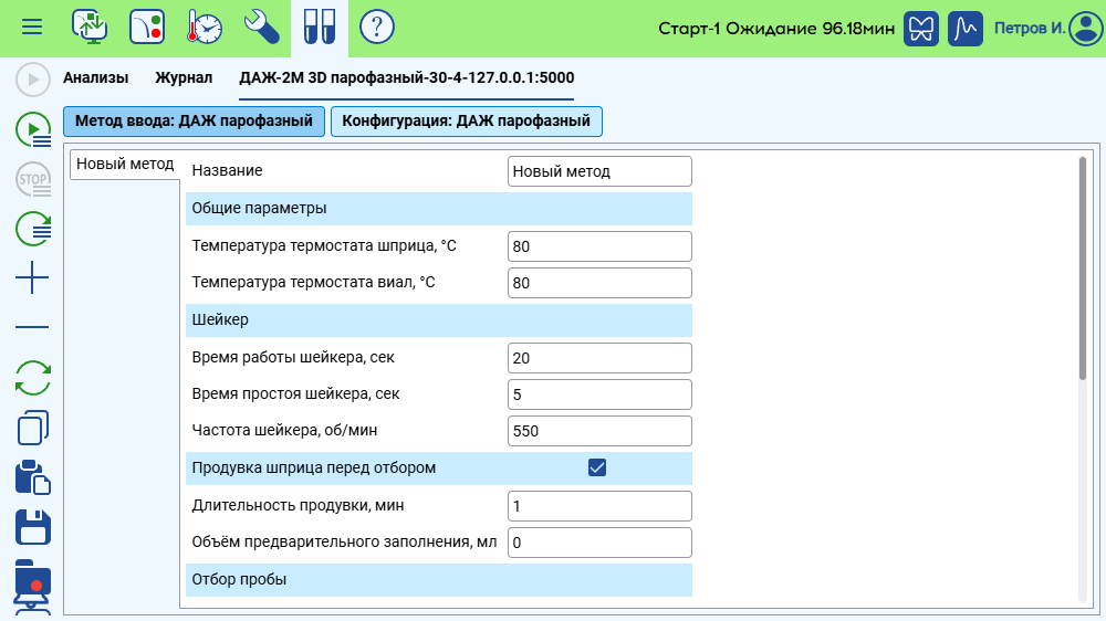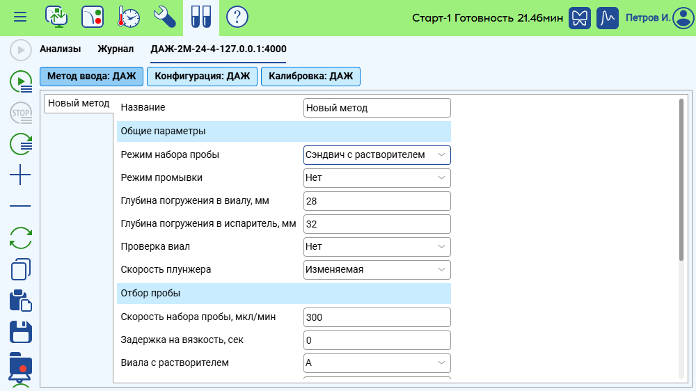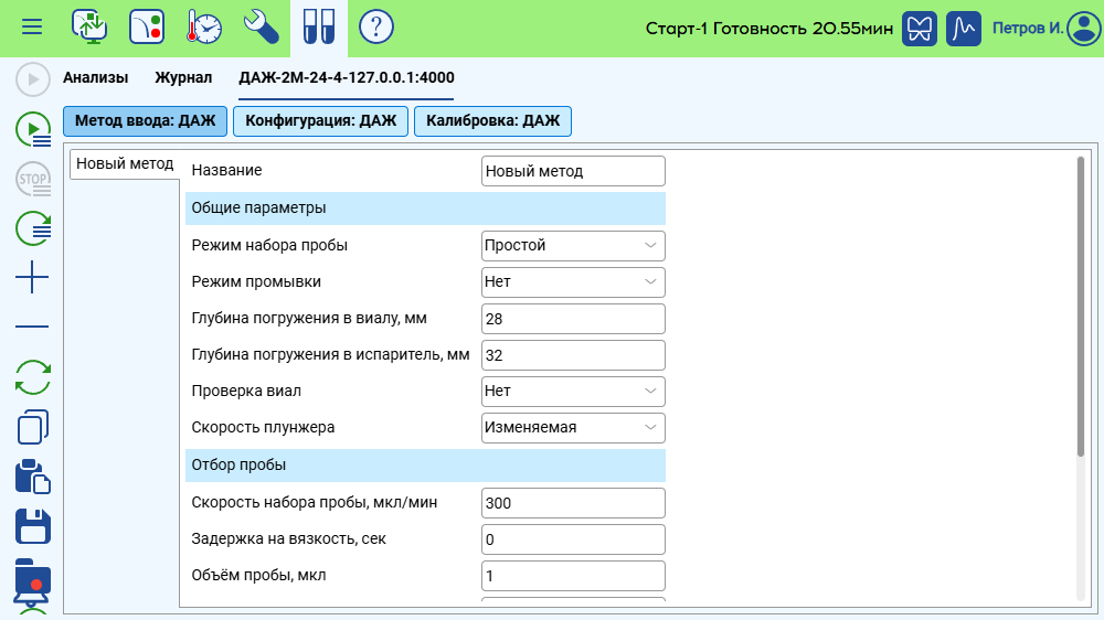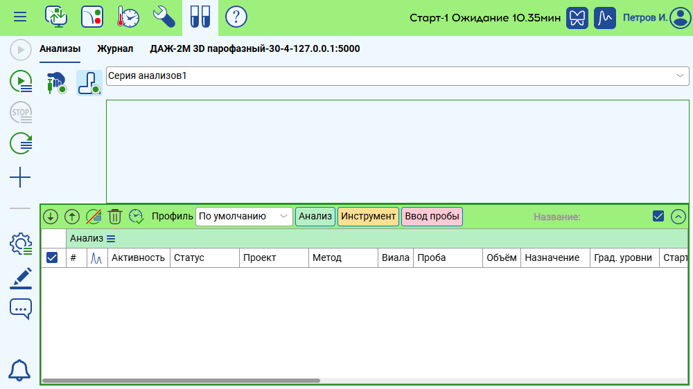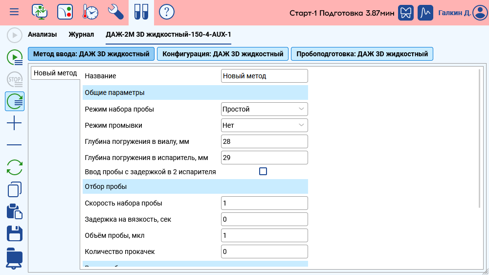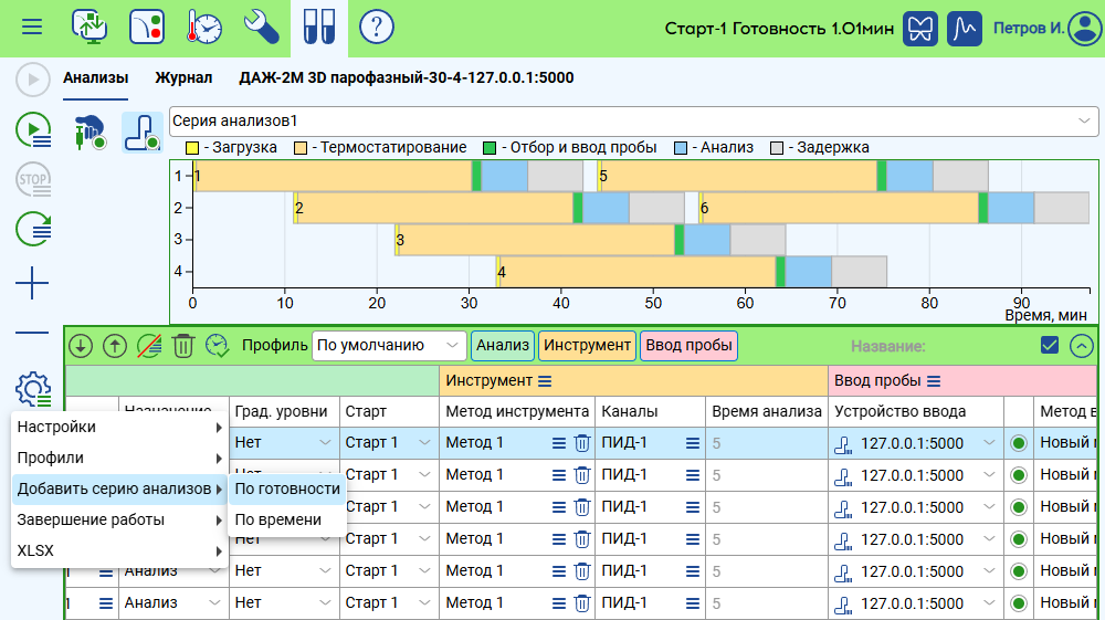 В рамках одной серии анализов допускается использование только метода ввода дозатора. При необходимости выполнения анализов с различающимися режимами дозатора, можно создать несколько серий анализов. Для этого заходят в настройки и добавляют серию анализов. И выбирают необходимый режим дозатора из созданных ранее. |
