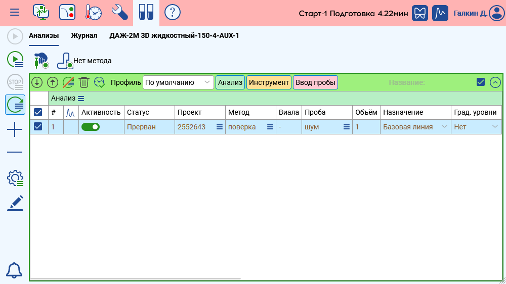 Шаги работы дозатора можно отслеживать по диаграмме на вкладке "Анализы":