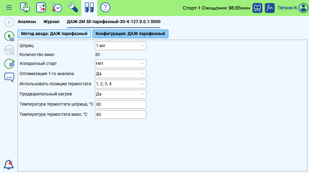 Режим работы парофазный анализ в дозаторе "ДАЖ парофазный" одинаков для всех анализов в последовательности. Это сделано намеренно, поскольку "Панель управления" использует "наложение времени подготовки пробы" для сокращения общего времени выполнения последовательности. Загрузка следующей виалы с образцом в инкубатор происходит во время выполнения предыдущего анализа (не завершенного).