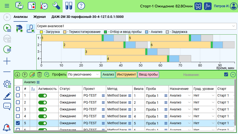 Статический парофазный анализа и анализ методом SPME включают в себя управление виалами (перенос) и стадию термостатирования образцов. Все эти действия занимают некоторое время. Для оптимизации процесса анализа паровой фазы в ГХ в "Панель управления" встроены специальные алгоритмы, благодаря которым подготовка следующего образца для ввода накладывается на текущий анализ образца.