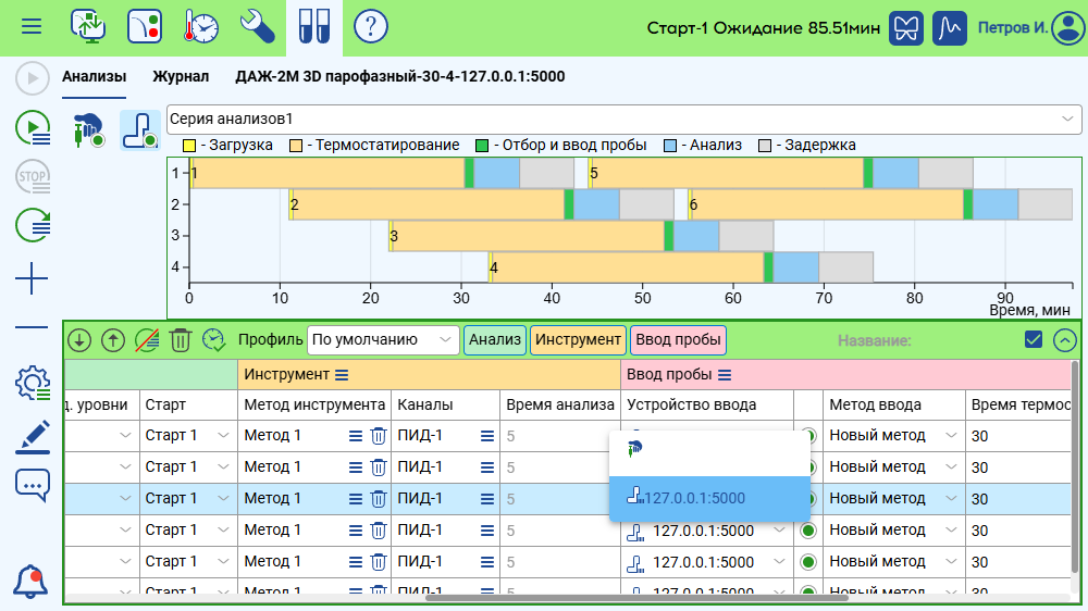 Рисунок 5.5 – Выбор дозатора в строке анализа в планировщике.
