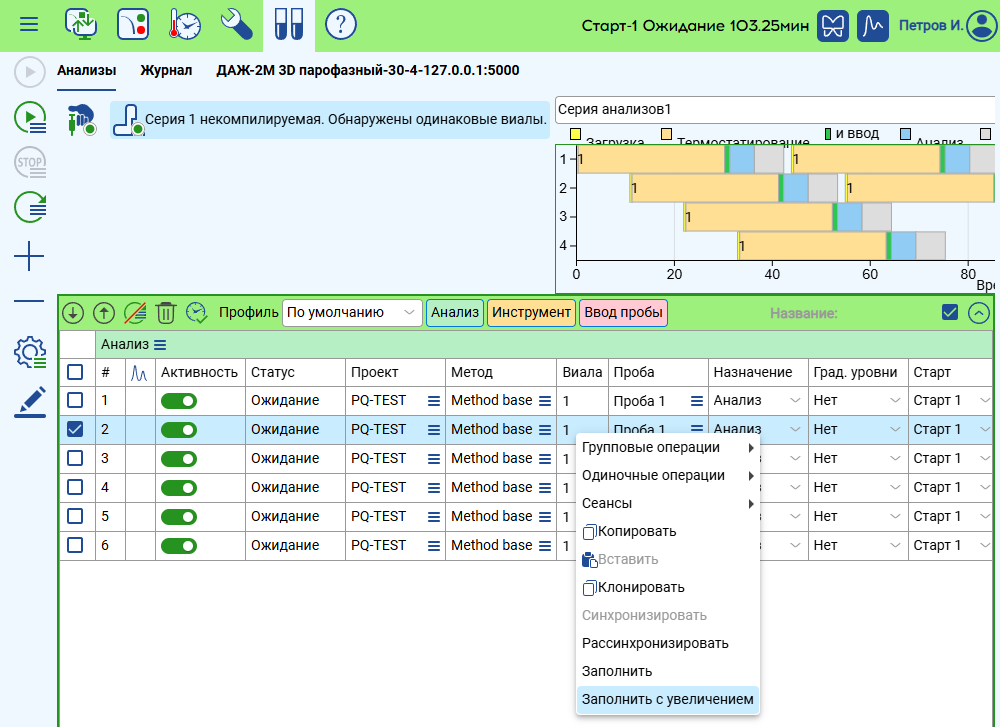 После добавления строк скорректируйте номера виал в последовательности анализов. Нажмите правую кнопку мыши, в выпадающем окне выберите "Заполнить с увеличением".