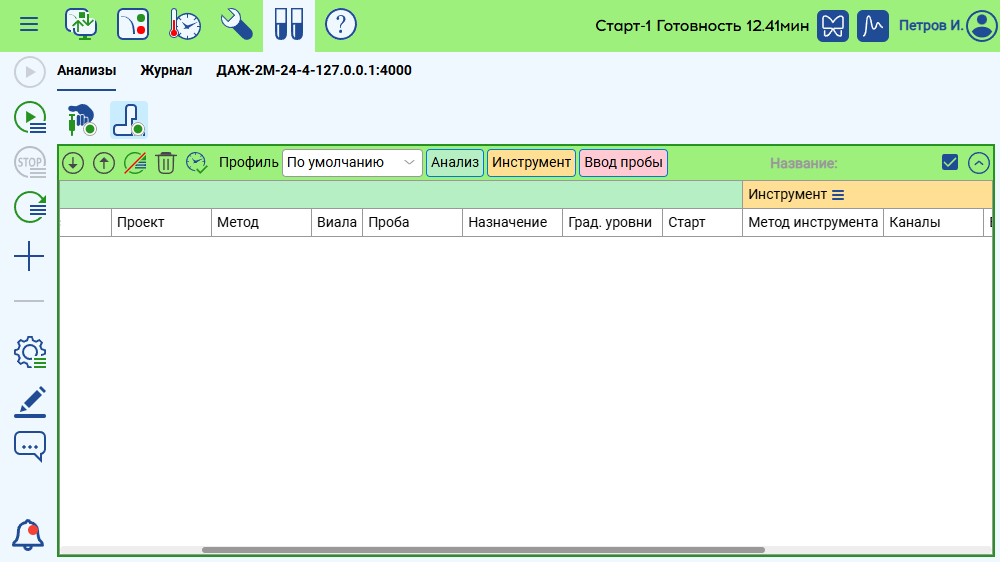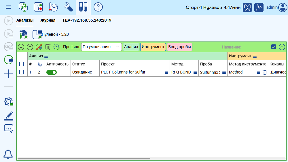 В столбце "Метод инструмента" выберите рабочий метод хроматографа, созданный ранее.