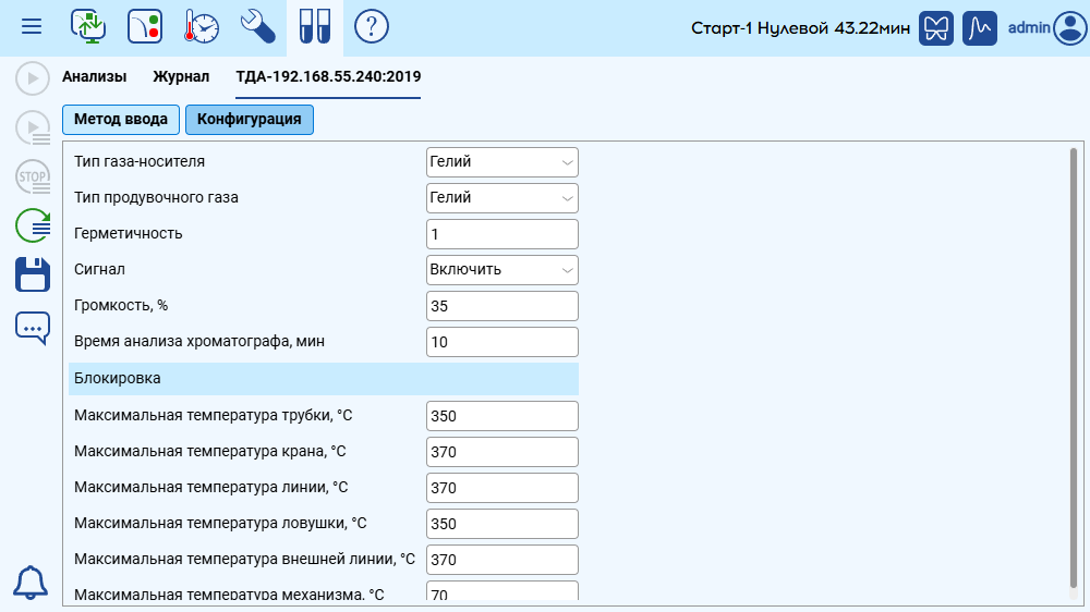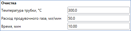 Время. Рекомендуемое время очистки трубки после анализа от 10 до 15 мин. Диапазон значений от 0 до 1440 мин. При задании времени 0, очистка трубки осуществляться не будет.