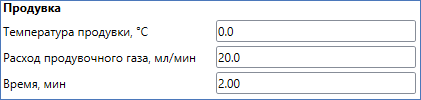 Температура продувки. Рекомендуемое значение для проб с высокой влажностью от 40 до 50 °C. При анализе проб с низкой влажностью рекомендуется устанавливать температуру продувки 0 °C. Для стабильной работы температура продувки должна быть минимум на 5 °C выше температуры окружающей среды. Диапазон значений от 0 до 425 °C. Заданное значение 0 °C подразумевает продувку при комнатной температуре.