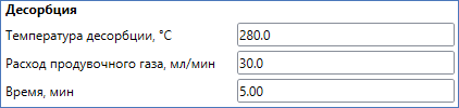 Температура десорбции. Задается во время десорбции анализируемых веществ с сорбционной трубки. Температура десорбции зависит от определяемых компонентов и типа сорбента, приводится в соответствующих методиках выполнения измерений. Диапазон температур от 35 до 425 °C.