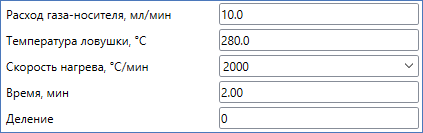 Деление. Используется для направления части пробы на сброс во время десорбции компонентов с ловушки. В случае задания деления потока 0 сброс пробы не производится и анализируемые вещества полностью направляются в колонку. Диапазон значений от 0 до 100.