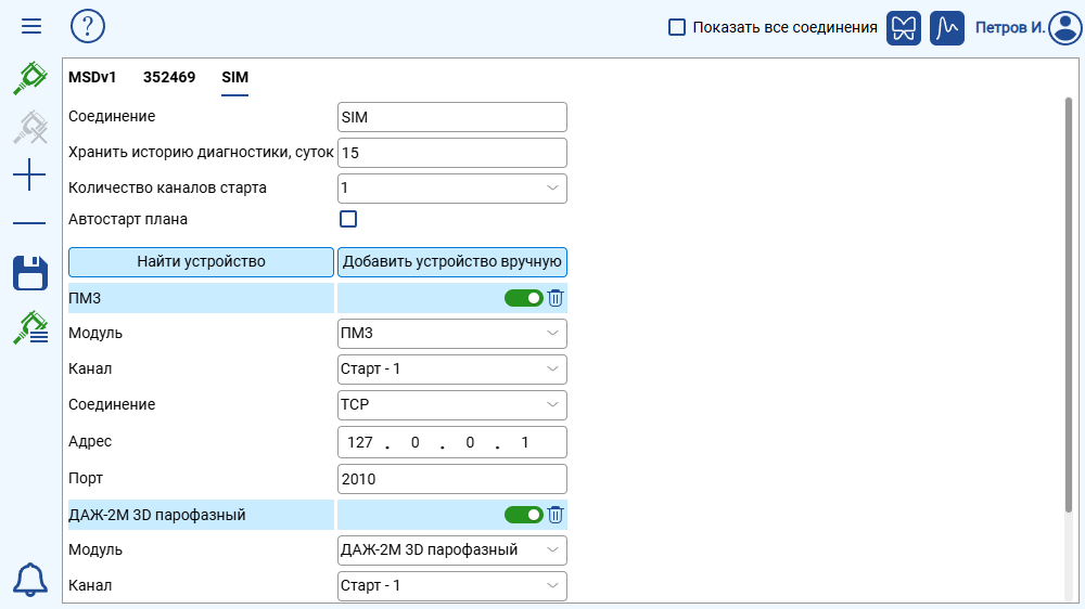 Все дозаторы единообразно подключаются на странице настройки соединений в программе "Панель управления".