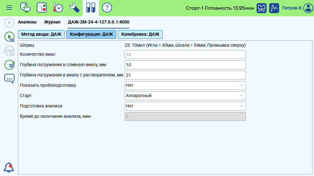 Дозатор опускает шприц до касания выбранного объекта (испаритель или виала) и поднимает его. На этом калибровка закончена.